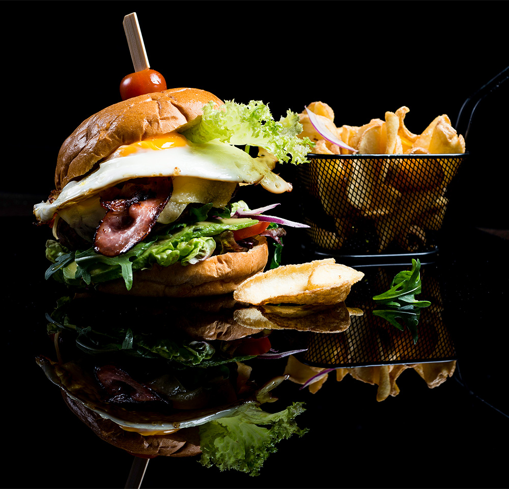 100% carne de ternera hecha en casa, bacon, queso, hojas de roble rojo, tomate Daniela, cebolla crujiente y salsa barbacoa.