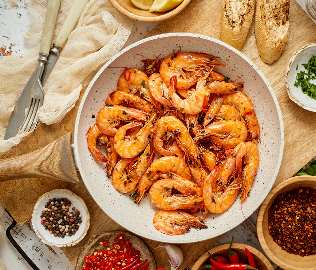 Langostinos, aguacate,mix de frutas de mango, naranja y manzanas verdes ácidas, tiernos brotes de lechugas, tomatitos cherry y mayonesa exótica con chile dulce.