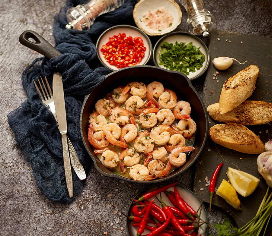 Langostinos, aguacate,mix de frutas de mango, naranja y manzanas verdes ácidas, tiernos brotes de lechugas, tomatitos cherry y mayonesa exótica con chile dulce.